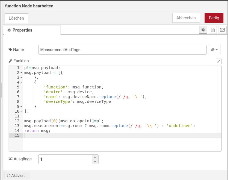 Das Mapping habe ich in Javascript in einer function Node programmiert. Für InfluxDB 1.8 und 2.0 gibt es unterschiedliche Versionen.