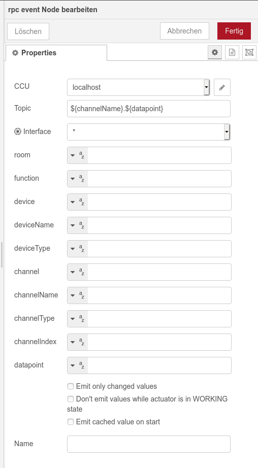 RedMatic kommt standardmässig mit einer Anbindung an die CCU3. Mit dem Block “rpc event” werden die CCU3-Events eingefangen und als einzelne Node-Red-Messages ausgegeben.