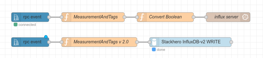 In einem zweiten Schritt forme ich noch alle Boolean-Werte von true/false nach 1/0 um, da ich mit Influx 1.x Probleme mit Booleans hatte. Unter 2.0 scheinen sie sauber zu funktionieren. Daher ist dafür keine Umformung notwendig.
